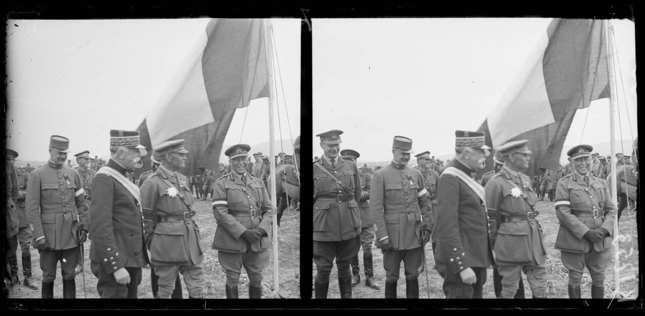 Camp de Lembet (partie ouest du Camp de Zeïtenlik). Revue passée par le général Mahon à l'occasion de la remise au général Sarrail de la Grande croix de Saint-Michel et de Saint-Georges.
