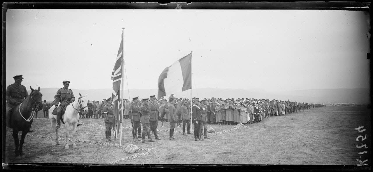 Camp de Lembet (partie ouest du Camp de Zeïtenlik). Revue passée par le général Mahon à l'occasion de la remise au général Sarrail de la Grande croix de Saint-Michel et de Saint-Georges. La musique anglaise.