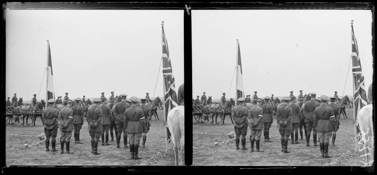 Camp de Lembet (partie ouest du Camp de Zeïtenlik). Revue passée par le général Mahon à l'occasion de la remise au général Sarrail de la Grande croix de Saint-Michel et de Saint-Georges. La musique anglaise.