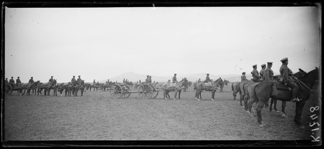 Camp de Lembet (partie ouest du Camp de Zeïtenlik). Revue passée par le général Mahon à l'occasion de la remise au général Sarrail de la Grande croix de Saint-Michel et de Saint-Georges. L'artillerie anglaise. [légende d'origine]