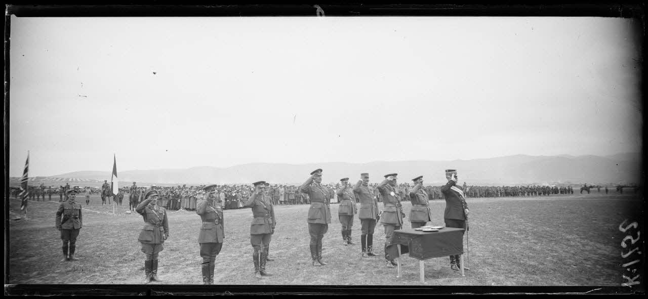 Camp de Lembet (partie ouest du Camp de Zeïtenlik). Généraux Mahon et Sarrail et officiers d'Etat major pendant le défilé. Au fond, la foule.