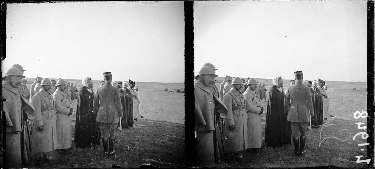 - au camp de Mailly, la visite de la mission musulmane, les membres de la mission assistent, en compagnie du général Gouraud, aux exercices : lancé de grenades, simulacre d'attaques et de tirs de barrages, le photographe prend également des vues diverses de l'assistance et une cérémonie de remise de décorations ;