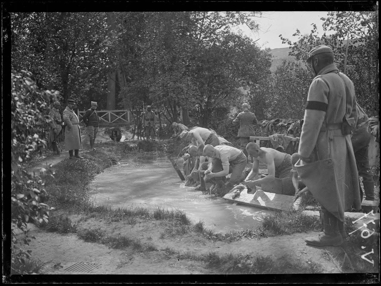 Camp de prisonniers allemands faits aux Bois-des-Buttes, près de la Ville-aux-Bois. Camp sanitaire d'observation d'Irval près de Jonchery. Ablutions et lavage du linge. [légende d'origine]