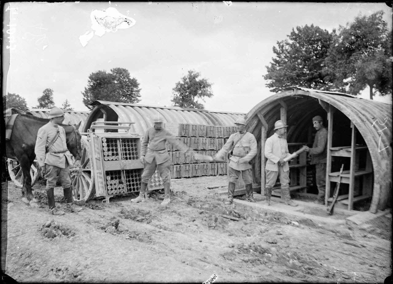 - une troupe de relève gagnant son emplacement en première ligne par les boyaux, une mitrailleuse Saint-Etienne M 1907 (SPA 25 L 1084), des soldats prenant leur déjeuner, un dépôt de matériel pour construire des tranchées (rondins de bois) ;