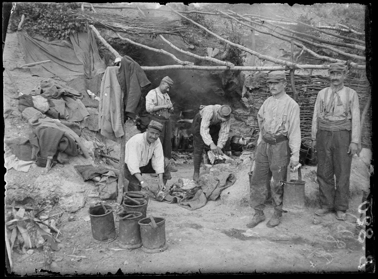Camp Déville : route du Four de Paris, cuisines de soldats dans une cagna. [légende d’origine]