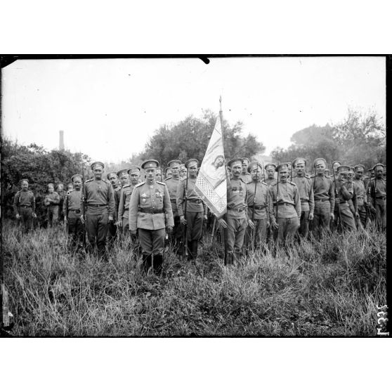 Camp Mirabeau, l'étendard russe et le commandant des troupes.