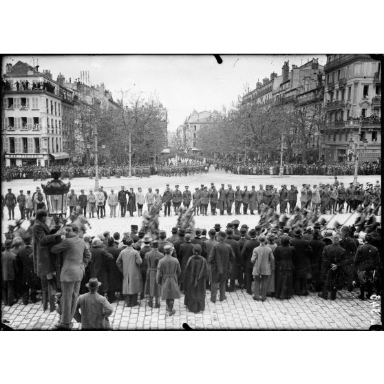 Marseille, place de la Préfecture, la foule après la revue. Les troupes prennent la rue Saint-Ferréol.