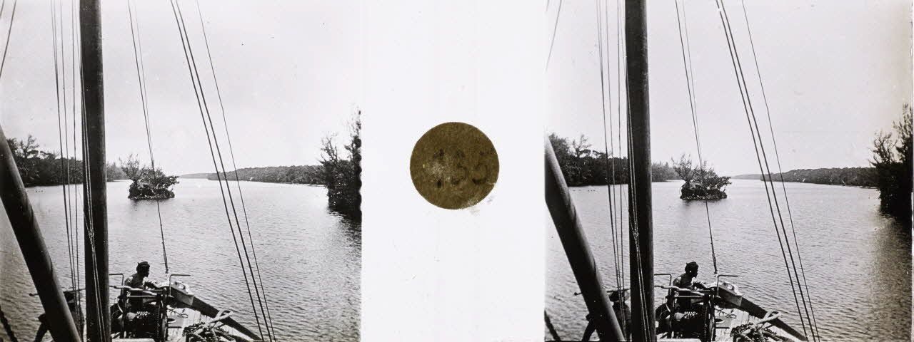 D68-10. Avant la colonisation, les villes de Madagascar n'étaient reliées que par des sentiers. Un énorme travail est donc entrepris dès 1895 par l'administration coloniale pour développer les voies de circulation sur l'île. Il s'agit tout d'abord de joindre Tamatave et Tananarive par route et par voie ferrée. En 1907, quand le lieutenant Denis débarque à Tamatave, le chemin de fer relie Ambila à Manjakandriana. Les travaux ferroviaires entre Manjakandriana et Tananarive sont en cours d'achèvement et il reste encore à réaliser le tronçon entre Ambila et Tamatave. Entre Tamatave et Ambila, il existait une suite de lagunes séparées par des seuils ou pangalanes. Le percement de ces seuils, entrepris dès 1897 par la compagnie des Messageries françaises de Madagascar, aboutit à la création du canal des Pangalanes en 1901. Le lieutenant Denis traverse ce canal à bord du bateau "Charles Bricka" et rejoint ainsi le départ de la voie ferrée à Ambila.