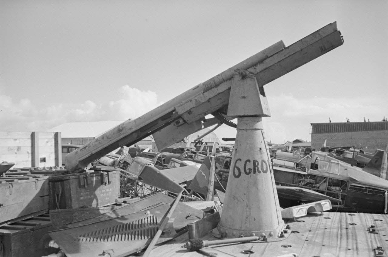 Le terrain d'aviation de Royan-Médis, les carcasses d'avions de chasse MS-406 et un canon de DCA (40 mm Bofors).