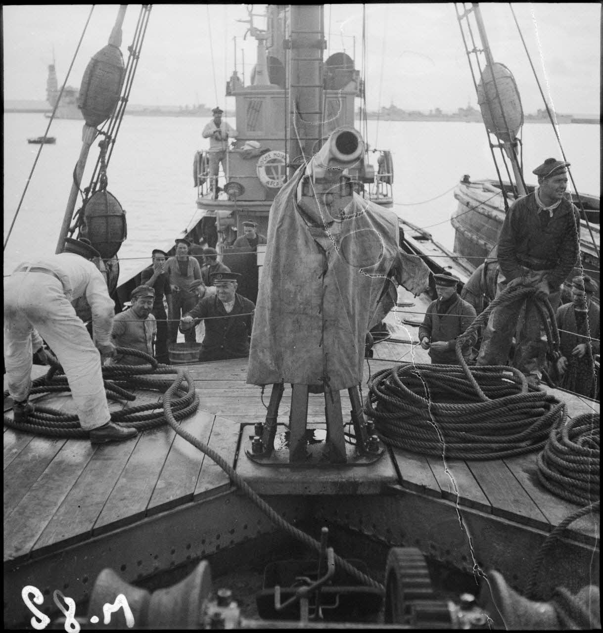 Canon de 75 mm Schneider modèle 1897 sur la plage avant du chalutier de la marine marchande Roche noire, réquisitionné et armé par la Marine nationale pour servir de dragueur de mines auxiliaire.