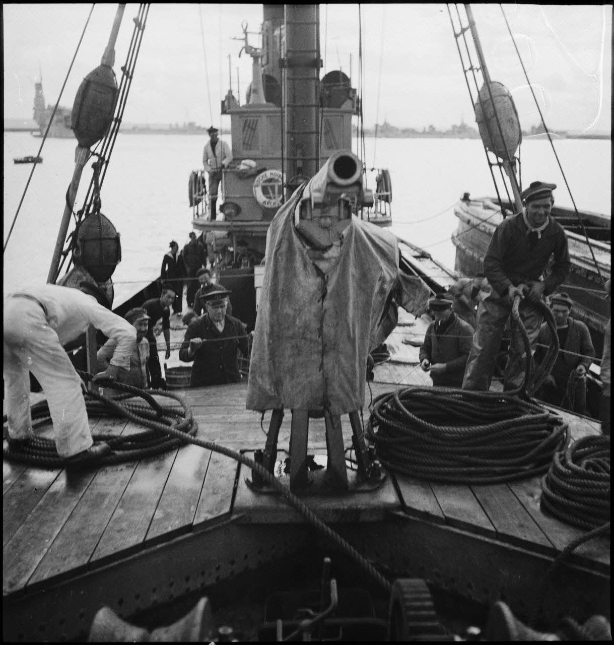 Membres d'équipage sur la plage avant du chalutier de la marine marchande Roche noire, réquisitionné et armé par la Marine nationale.