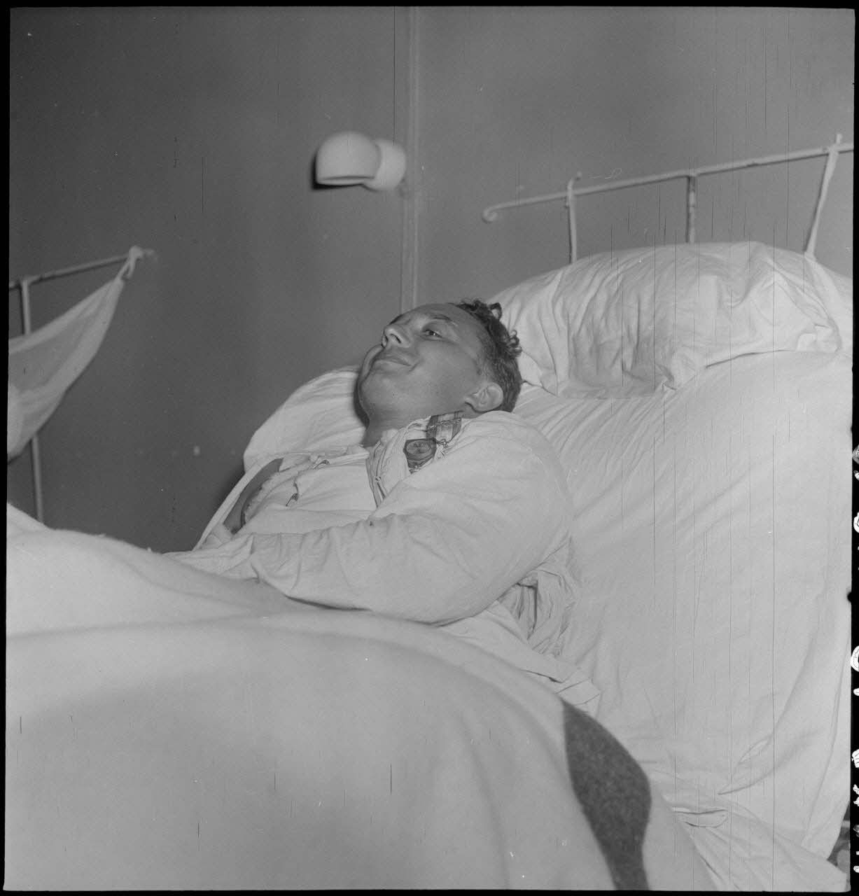 Soldat alité de 1re classe du GT (groupe de transport) 515 arborant sa médaille à l'hôpital Lanessan à Hanoï.