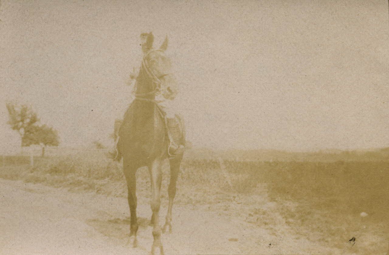 Juillet 1915. a - Mr Riser, médecin. b - commandant Puntous. c - Maréchal de logis Jouan. d - Yves va au devant du commandant à son arrivée d'excursion.