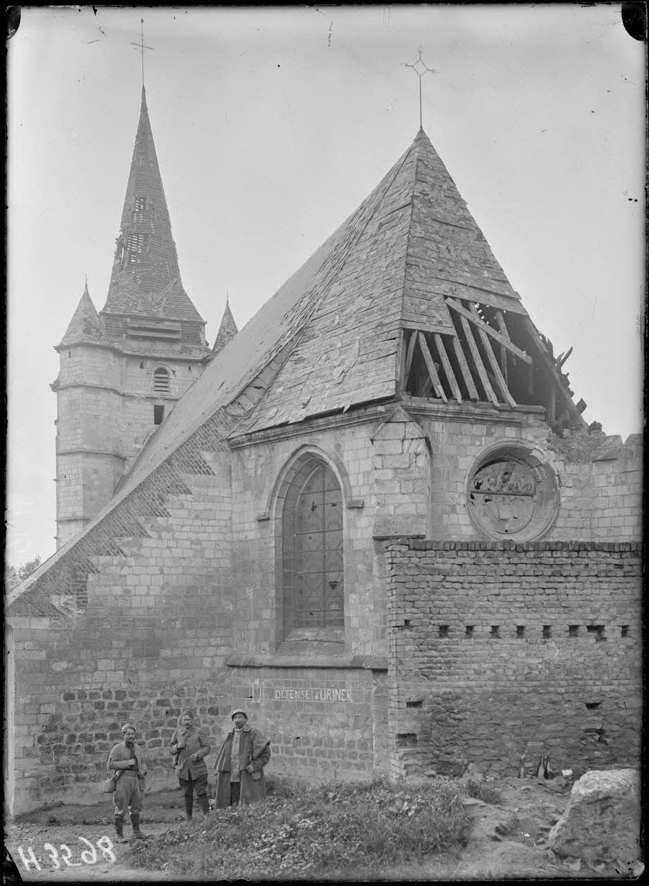 A Eclusier, des chalands transportant des pierres sont déchargés dans des camions pour la réfection des routes. Plus loin, un caveau funéraire de cimetière a été transformé en abri contre les bombardements.