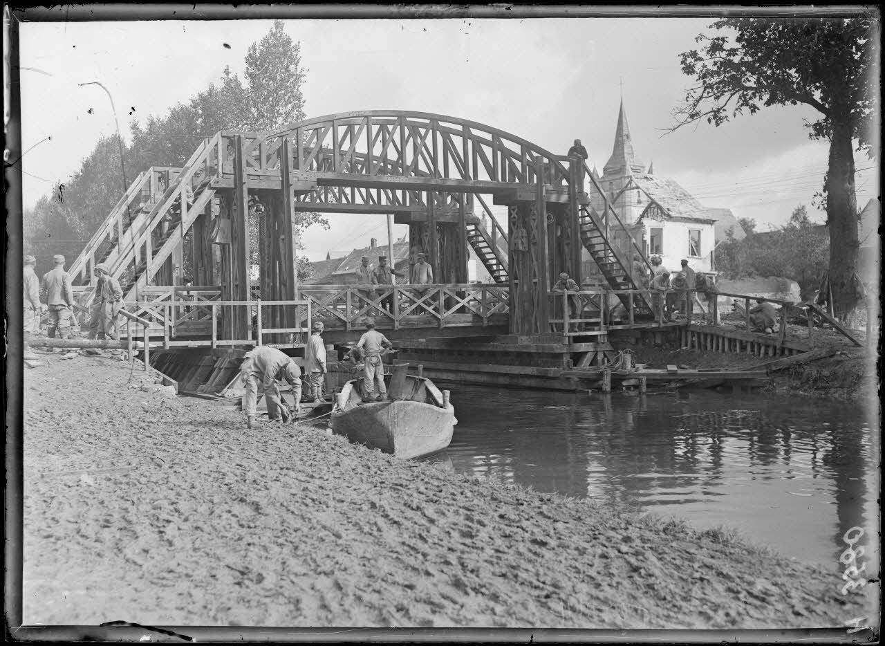 A Eclusier, des chalands transportant des pierres sont déchargés dans des camions pour la réfection des routes. Plus loin, un caveau funéraire de cimetière a été transformé en abri contre les bombardements.