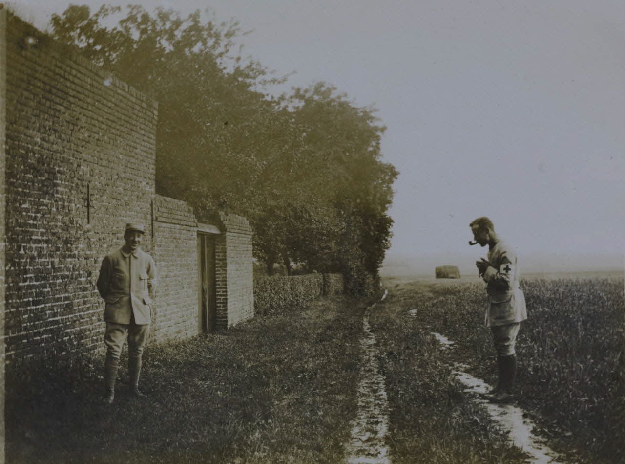 Les archives photographiques du médecin major Augarde, affecté au 138e régiment d''infanterie, sont caractéristiques de la production d''images fixes des militaires pendant la Grande Guerre : portraits de camarades, édifices religieux et terrains dévastés par les bombardements ennemis, etc. Les photographies cotées en D0349-003 étaient conditionnées dans une enveloppe intitulée « L’Artois / Parrajou ».