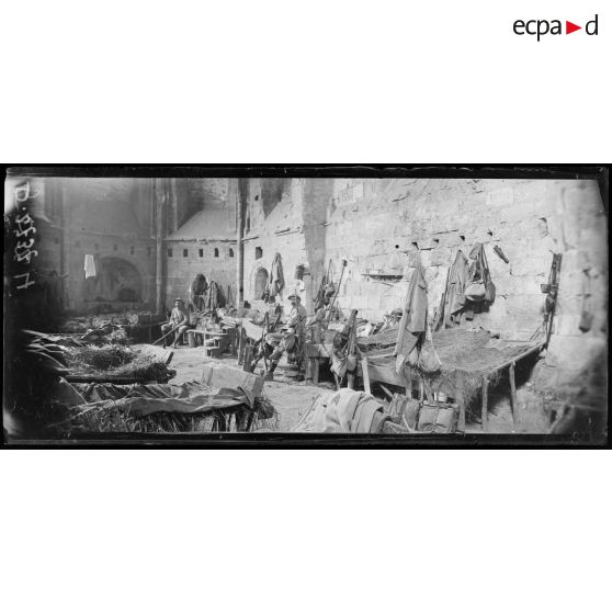 Entre Ribécourt et Bailly (Oise). Ferme de Freneux, intérieur de la chapelle où sont logés les territoriaux.