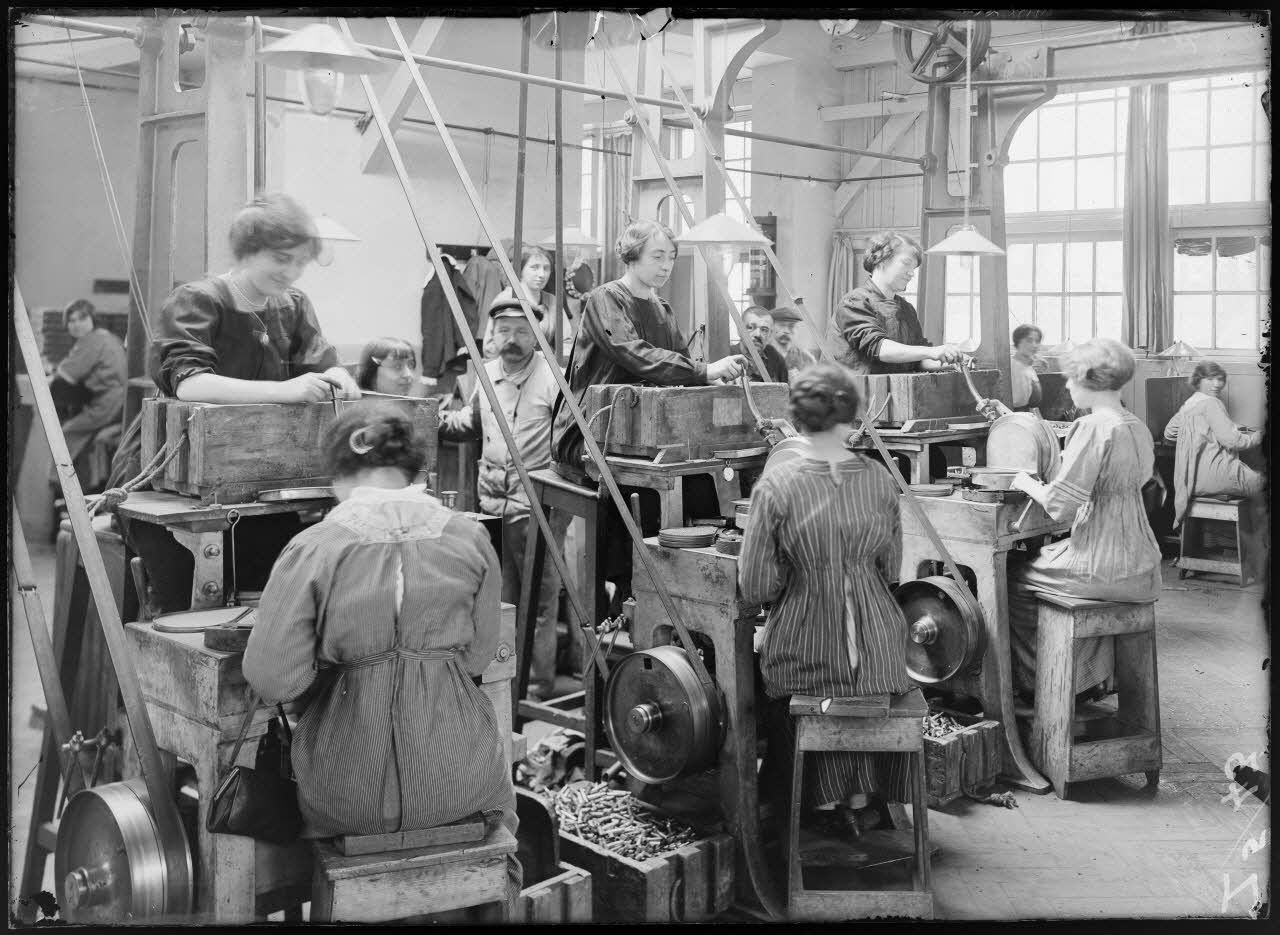 Société Eclairages électriques de Suresnes. Atelier de vérification de la conicité du culot des obus de 75.