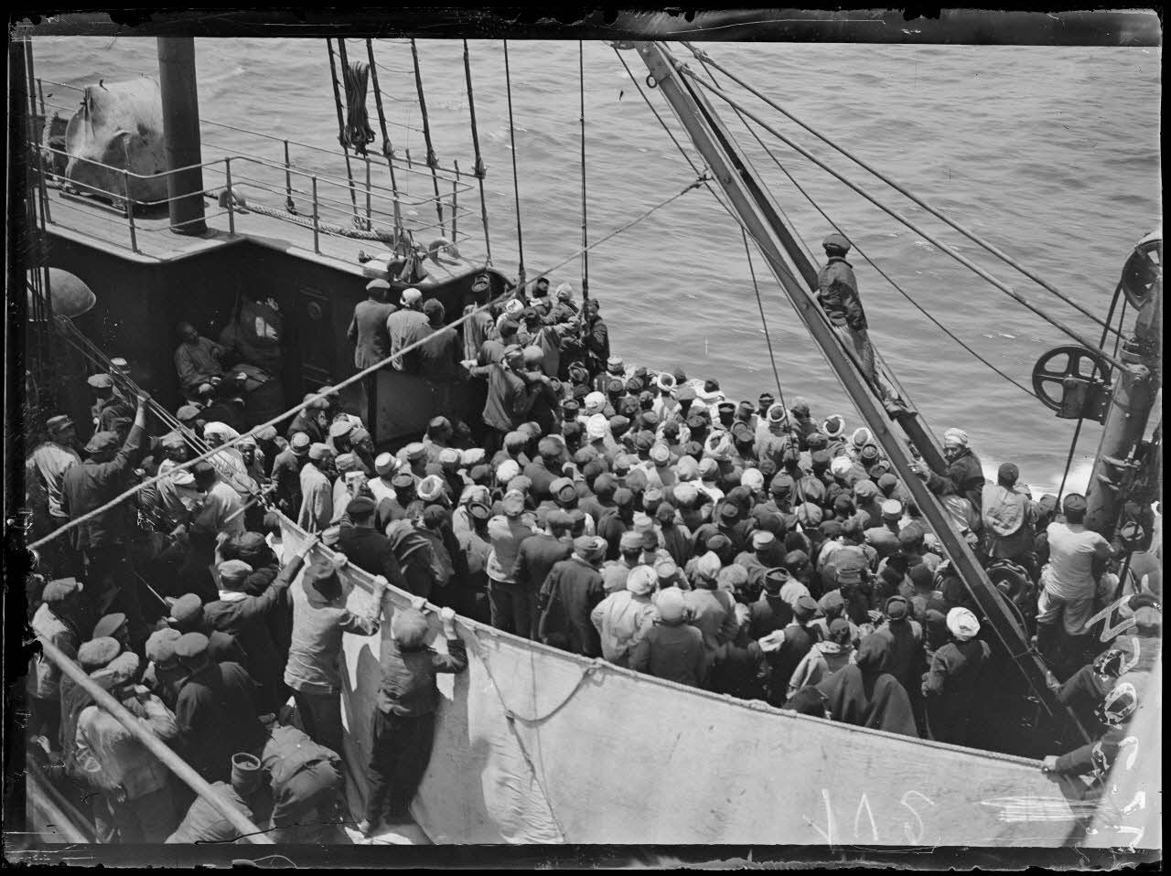 Casablanca. A bord de l'Abda, les indigènes regardant la terre du Maroc. [légende d'origine]