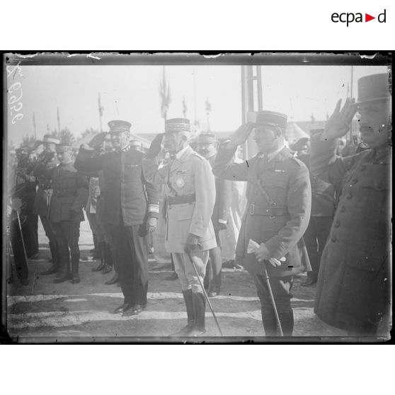 Casablanca. Maroc. Inauguration du concours agricole. Les généraux Lyautey et Calmel et l'amiral Niblack saluant pendant l'exécution de la Marseillaise.