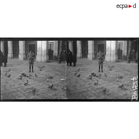 Trévise. Soldat français donnant du pain aux pigeons sur la place des Seigneurs.