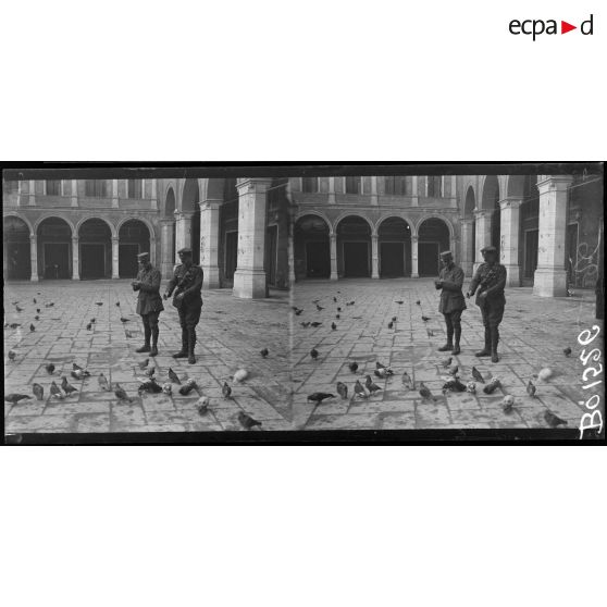 Trévise. Soldats anglais et français donnant du pain aux pigeons sur la place des Seigneurs.