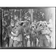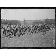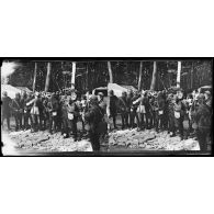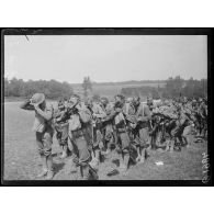 Au camp américain de Dommiers, des masques contre les gaz sont distribués afin que les soldats…