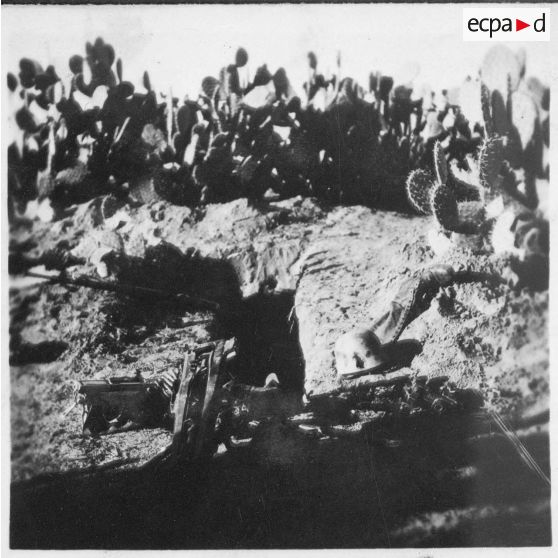 La campagne de Tunisie : restes d'une mitrailleuse allemande sur la cote 354.