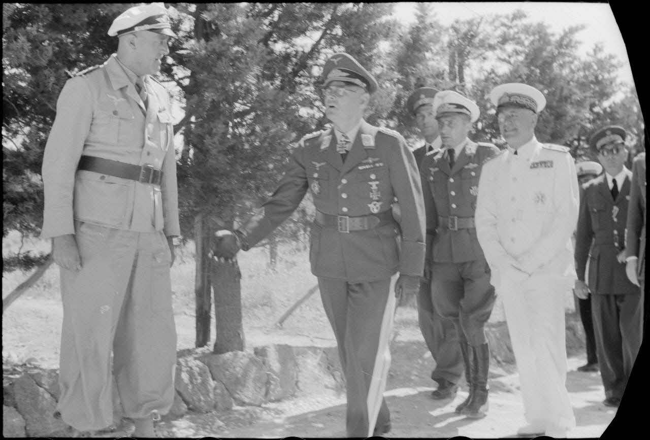 L'amiral italien Inigo Campioni guide son invité le général Martin Fiebig lors de son inspection des positions allemandes du Mont Filérimos.<br>