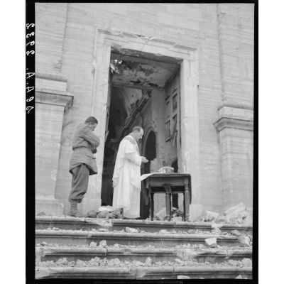 Un aumônier militaire catholique se trouve dans l'église, en partie détruite, d'un village situé à proximité des premières lignes italiennes.