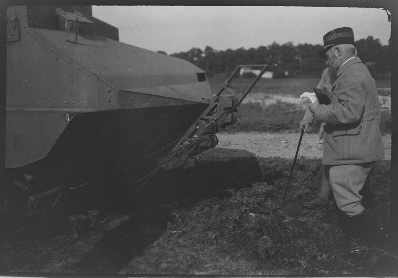 Etude du fonctionnement d'un dispositif de coupe de barbelés installé à l'avant d'un prototype de char Schneider.