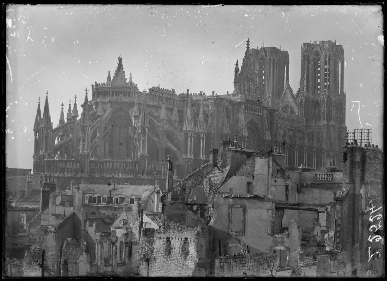 Reims. Aspect du quartier Cérès incendié. Au fond la cathédrale.