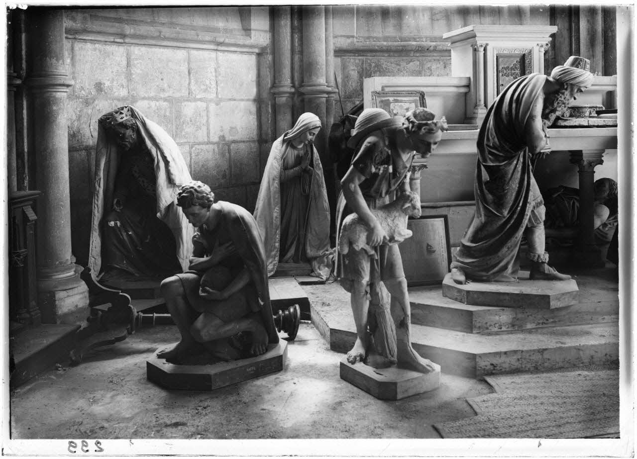 Cathédrale de Soissons. Les Saints de la Crèche relégués dans une chapelle latérale pendant les bombardements. 1918. [légende d'origine]