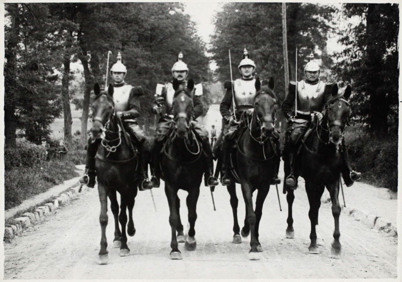 Cavalerie, Arme blindée - Quatre cavaliers du 12e RC avec leurs sabres dans un chemin de campagne. [légende d'origine]