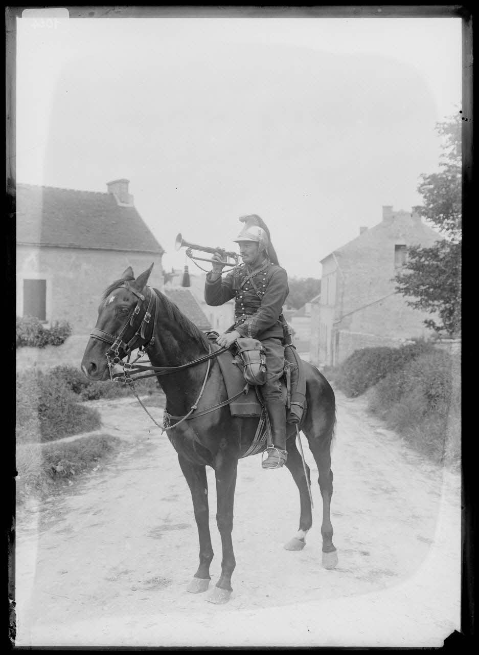 Cavalerie - Dragon à cheval jouant du clairon. [légende d'origine]
