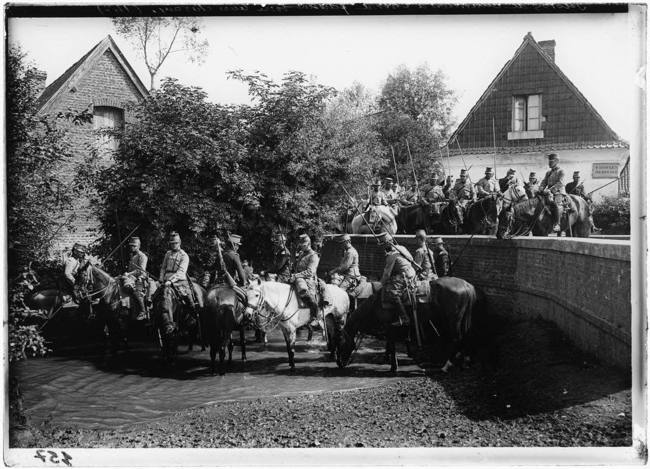 [Cavaliers au bord d'une rivière pour rafraîchir les chevaux.]