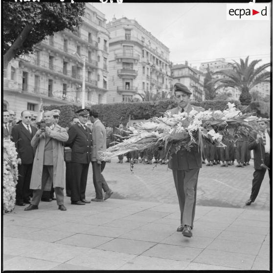 Alger. Dépôt de gerbe de fleurs par le général Massu.