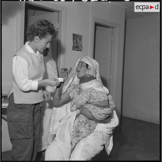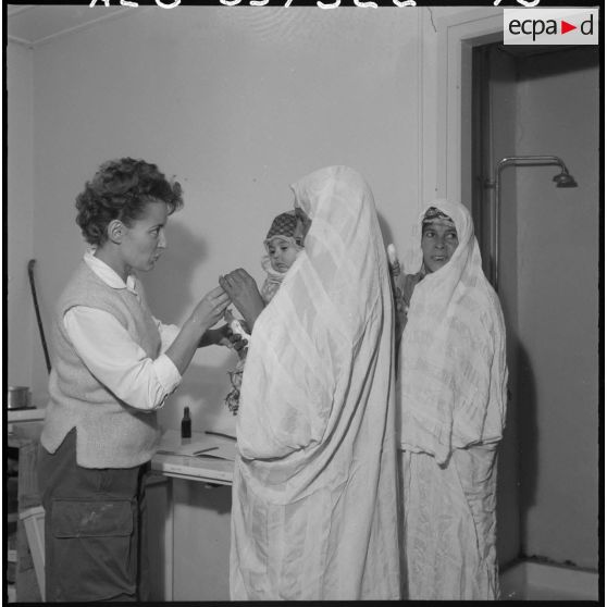 Centre de regroupement de population de Tafaraoui. Une femme du personnel médical soigne une femme et son enfant.