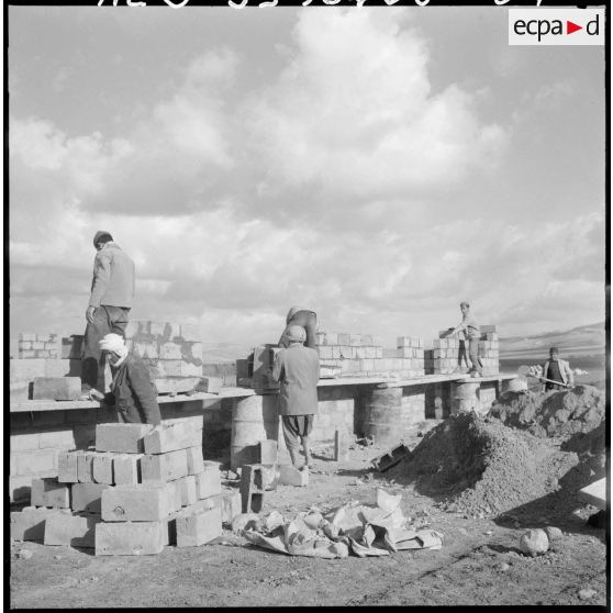 Centre de regroupement de population de Tafaraoui. Des ouvriers sur un chantier.