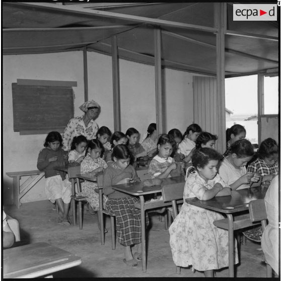 Centre de regroupement de Sidi Madani. Les petites filles apprennent à faire du tricot et de la couture.