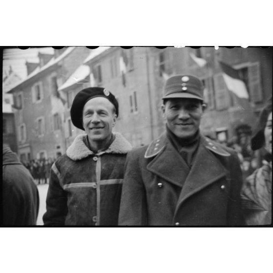 Le commandant norvégien Ording et le colonel Yehman, de l'armée nationaliste chinoise, posent lors d'une cérémonie mititaire à Masevaux dans le cadre d'une visite d'attachés militaires étrangers sur le front d'Alsace.
