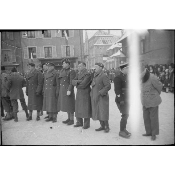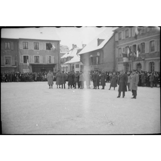 Au cours d'une cérémonie militaire, des attachés militaires étrangers sont rassemblés sur la place des Alliés à Masevaux dans le cadre d'une visite sur le front d'Alsace.