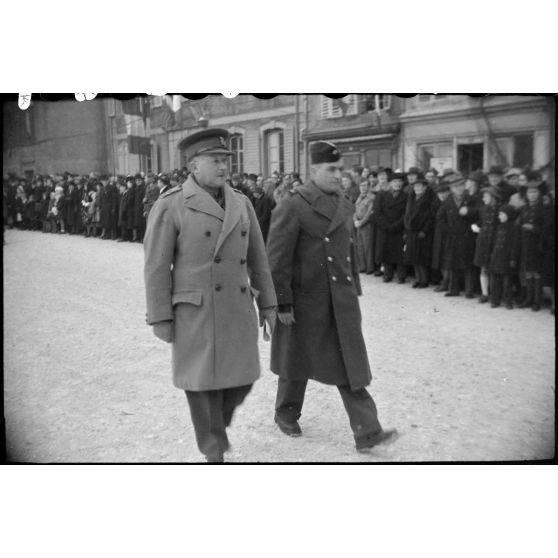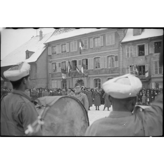 Le général de division Carpentier, commandant la 2e DIM (division d'infanterie marocaine), se dirige vers la nouba du 5e RTM (régiment de tirailleurs marocains) lors d'une cérémonie sur la place des Alliés à Masevaux dans le cadre d'une visite d'attachés militaires étrangers sur le front d'Alsace (photo floue).