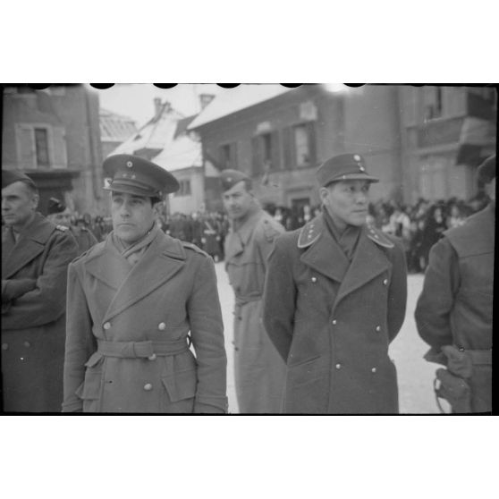 Cérémonie militaire à Masevaux dans le cadre d'une visite d'attachés militaires étrangers sur le front d'Alsace.<br>