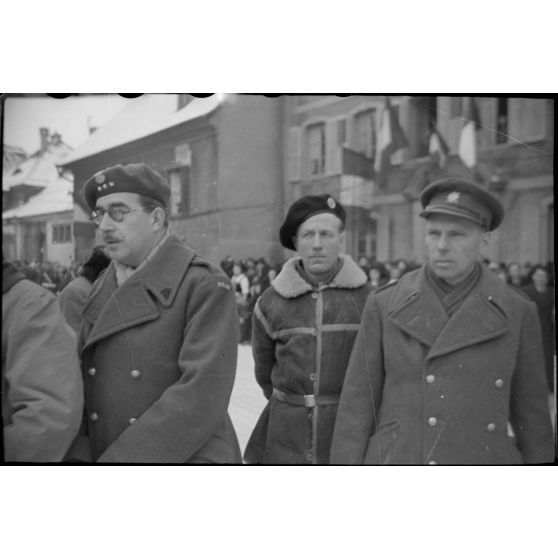Le capitaine polonais Orlowski, le commandant norvégien Ording et le colonel Bülandr, attaché militaire du gouvernement provisoire tchécoslovaque, posent lors d'une cérémonie mititaire à Masevaux dans le cadre d'une visite d'attachés militaires étrangers sur le front d'Alsace.