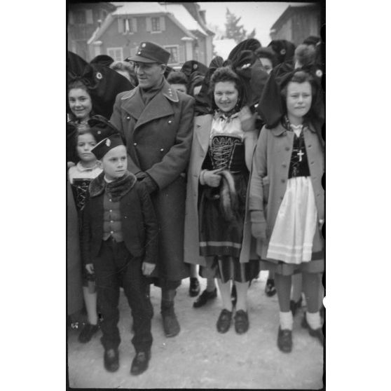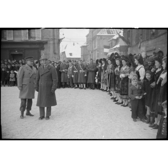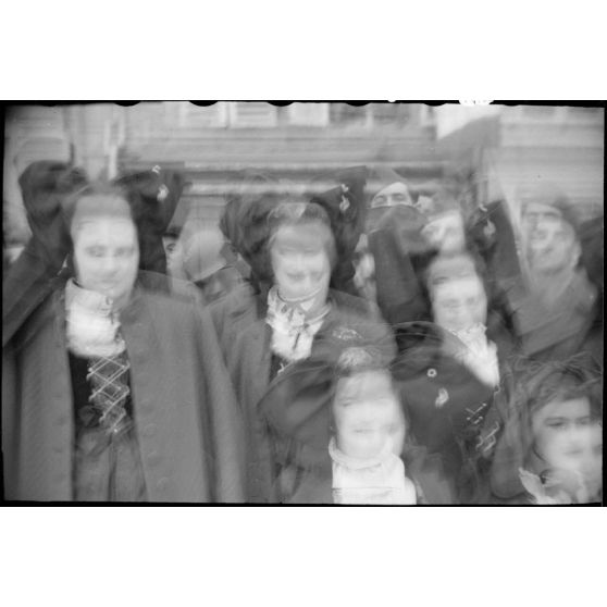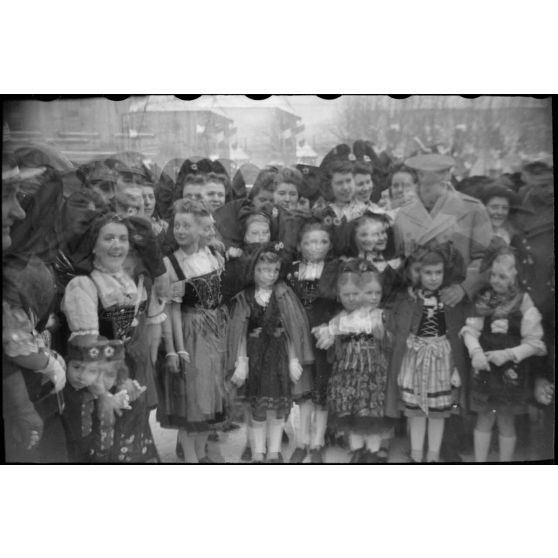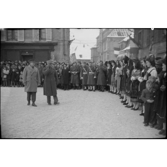 Jeunes femmes et enfants vêtus du costume traditionnel alsacien lors d'une cérémonie militaire à Masevaux.