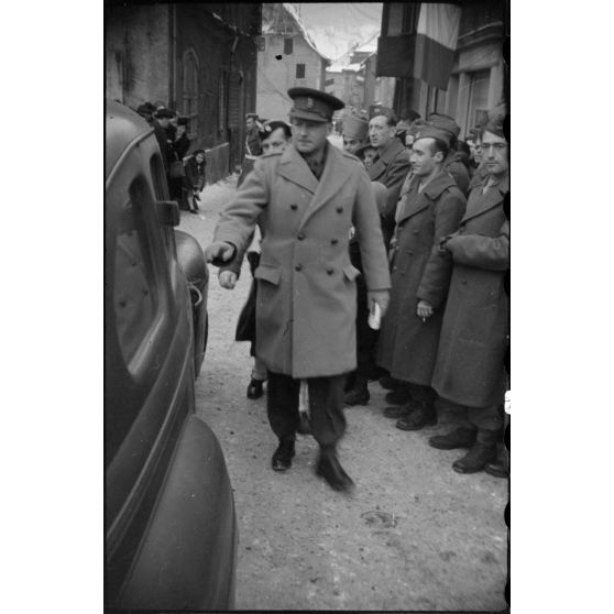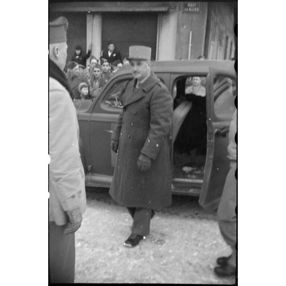 Le général de division Carpentier, commandant la 2e DIM (Division d'infanterie marocaine), arrive en voiture sur la place des Alliés à Masevaux pour y présider une cérémonie militaire en présence d'une délégation d'attachés militaires étrangers en France, en visite sur le front d'Alsace.