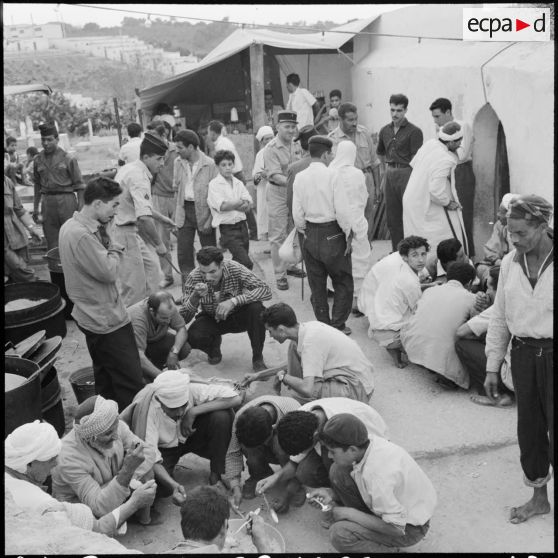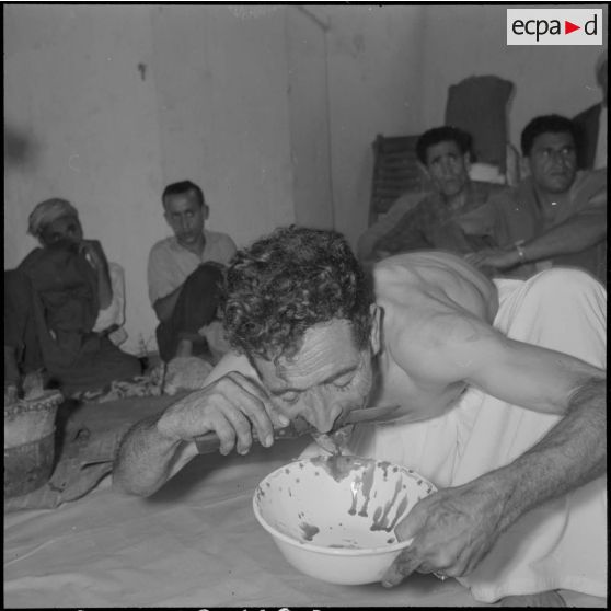 Fête des Amarias : les hommes et les jeunes garçons sont réunis autour de plats de semoule.