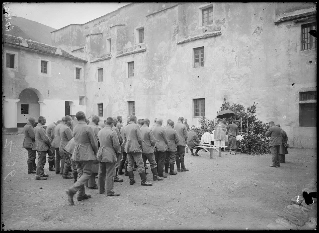 Cervione. Dépôt de prisonniers allemands. Une messe dans la cour. [légende d’origine]