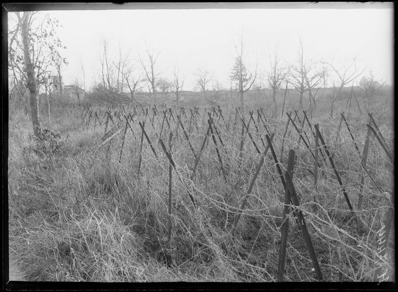Challerange. Réseaux de barbelés devant la gare. [légende d'origine]
